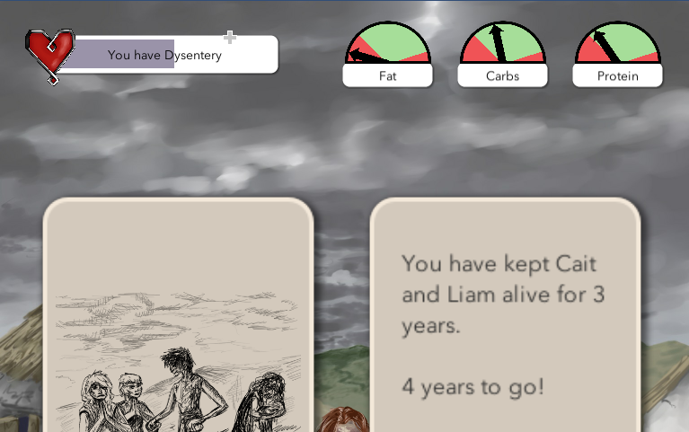 The player takes on the role of both Cait and Liam; a woman trying to survive the Great Famine, and her modern day descendant.  They take turns as each character, playing cards to balance their nutrient gauges.  As Cait this could be some spoiled meat, blighted potatoes, and watered down soup.  For Liam this might be a slice of pizza, a bowl of cereal, and a granola bar.  This draws deliberate attention to the struggle of Cait to survive in comparison to the ease Liam has - with most of his cards giving massive nutrient bonuses.  Ending a turn with any of the character’s gauges in the red will cause them to lose health, and dropping below the 80% healthy threshold means there is a chance for them to become ill - making it even harder to survive.