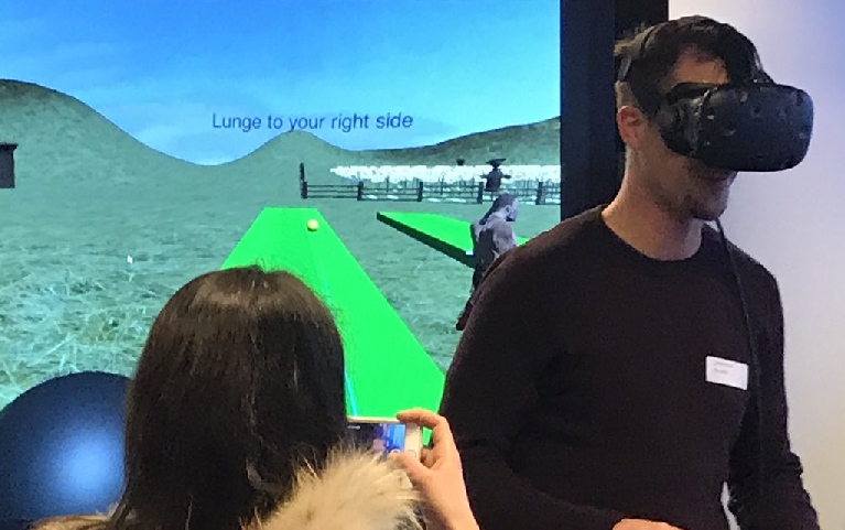 Patients wear the headset & Vive Trackers (5 in total - lower legs, upper legs, and waist) and are instructed on moves to perform to compliment knee injury recovery.